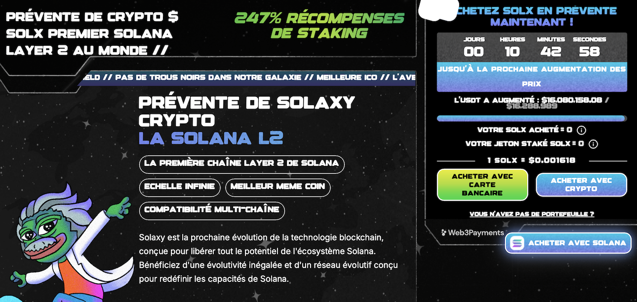 Solaxy ($SOLX) répond aux limites de Solana avec son réseau Layer-2. En déchargeant une partie des transactions sur sa sidechain, Solaxy pourrait améliorer l’efficacité et la scalabilité de Solana, évitant ainsi un effondrement de l’écosystème.