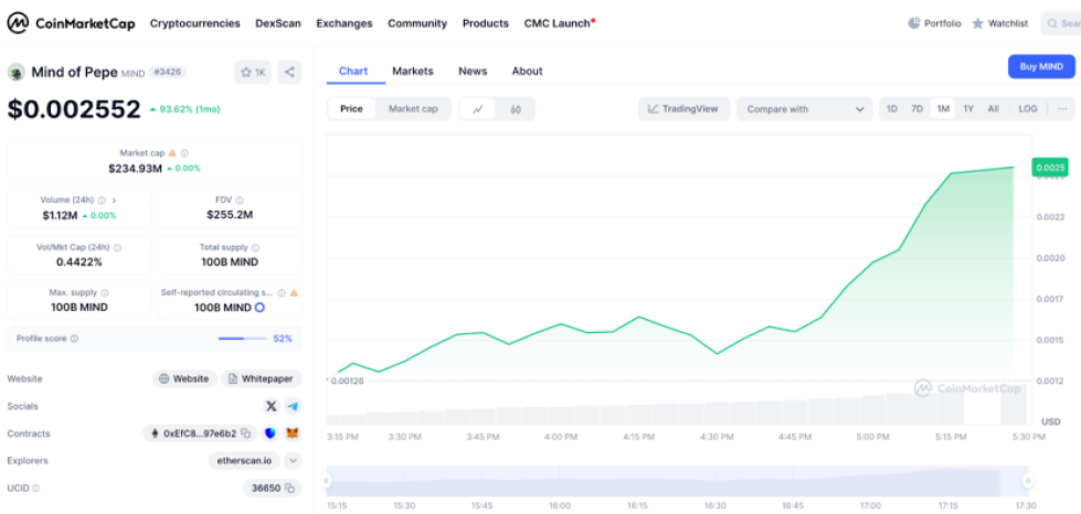 На момент публикации новости рыночная капитализация $MIND превысила $132 млн, а объем торгов на DEX за 24 часа составил $2,93 млн (coinmarketcap).