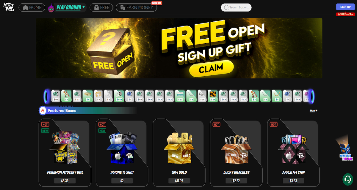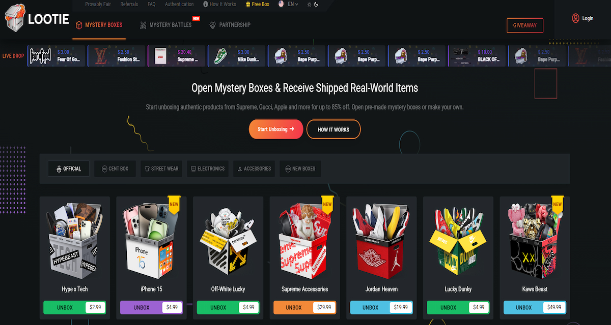 Procesas yra paprastas – pasirinkite dėžutę, atidarykite ją ir, jei norite, galite parduoti arba gauti laimėtą prizą. Platforma taip pat siūlo galimybę gauti dovanų kuponus, jei nenorite fizinio daikto. Vizualiai ji yra patraukli ir labai draugiška vartotojui.