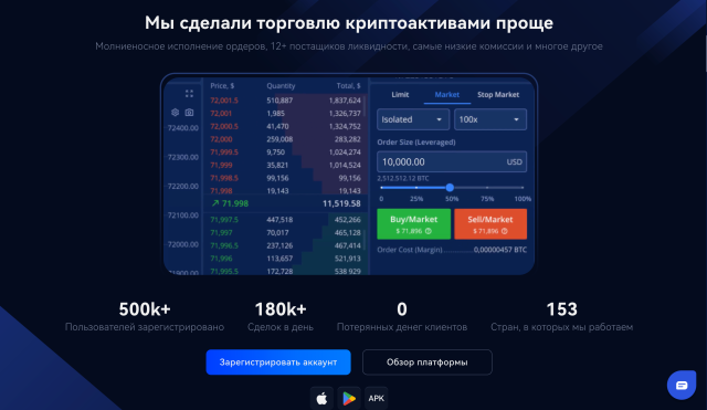 - Поддержка более 55 популярных криптовалют и 100+ торговых пар