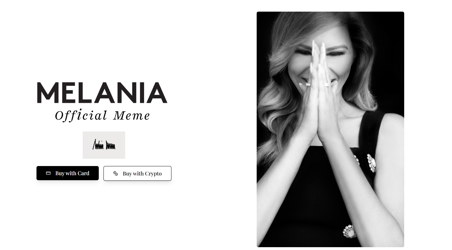 - De officiële meme coin van Melania Trump: $MELANIA is de officiële meme coin van Melania Trump, first lady van de Verenigde Staten en vrouw van Donald Trump. Volgens de website is $MELANIA een digitaal verzamelobject, al wordt het in werkelijkheid vooral gebruikt door crypto traders voor speculatie.