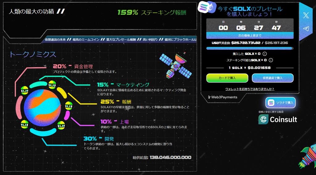 Solaxyはすでに市場で注目を集めており、新しい仮想通貨の可能性を示している。プレセールで2,590万ドル(約39億円)以上を調達した。執筆時点でのSOLX価格は0.00166ドル(約0.25円)であり、次回の価格上昇までの期間は限られている。また、ステーキング機能も導入されており、7.2百万SOLX以上がすでにステーキングされている。現在、ステーキング報酬は年間推定158%のリターンが見込まれ、月次および日次で配布される。