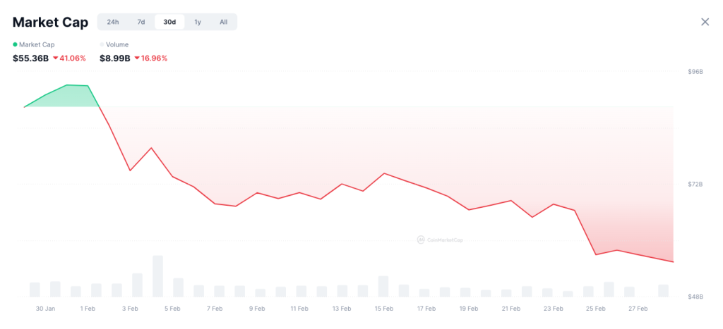 มูลค่าตลาดรวมของ Meme Coin ลดลง 41% ในช่วง 30 วันที่ผ่านมา สาเหตุหลักมาจากการเปลี่ยนแปลงของสภาวะเศรษฐกิจมหภาค (macroeconomic headwinds) ที่ส่งผลให้กำไรส่วนใหญ่ที่ได้รับหลังจากการชนะการเลือกตั้งประธานาธิบดีของ Donald Trump ในเดือนพฤศจิกายนได้หายไป