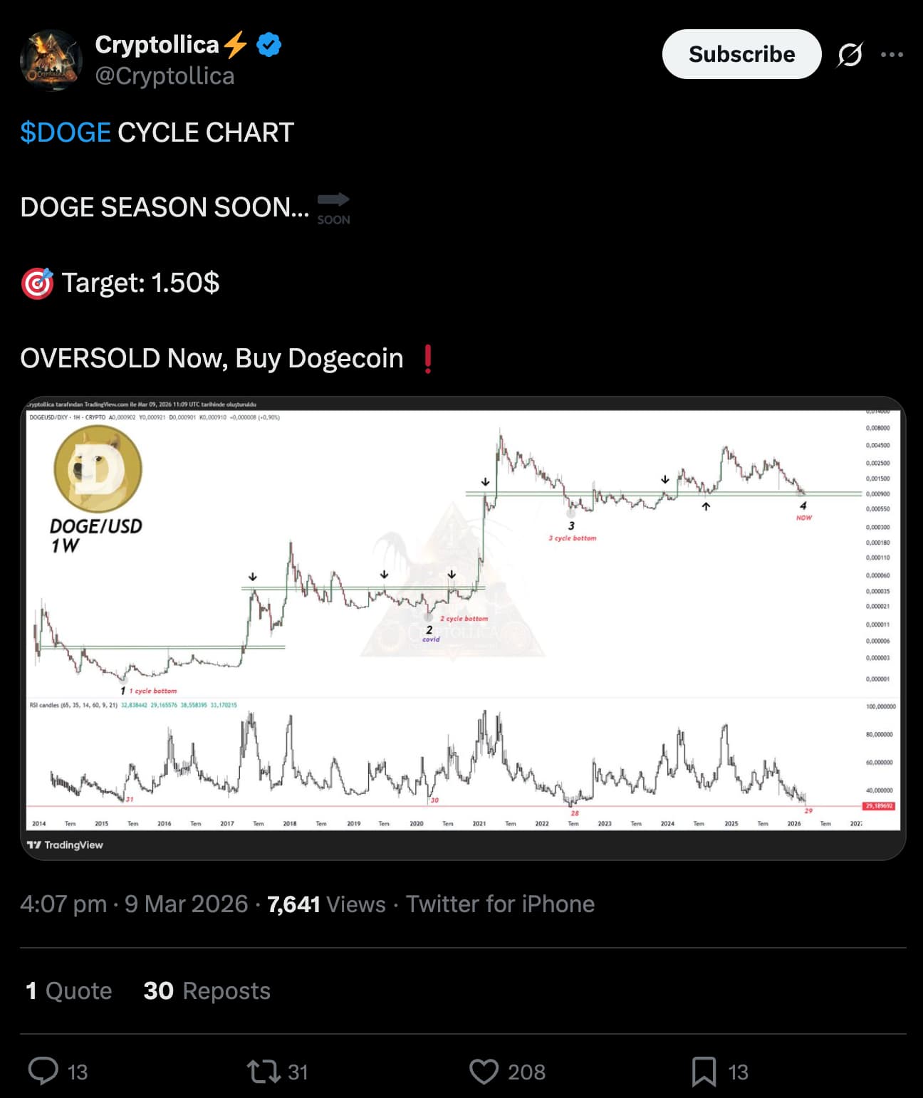 El analista Cryptollica ha compartido un gráfico del ciclo de DOGE (basado en el par DOGE/DXY) que destaca condiciones de sobreventa, anticipa la llegada de una “temporada de DOGE” pronto y pronostica un objetivo de 1,50 dólares.