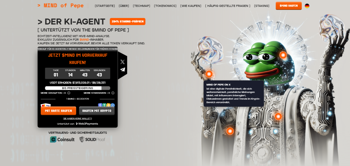 | Zahlungsmethoden | SOL, ETH, USDT, USDC, Kreditkarte |