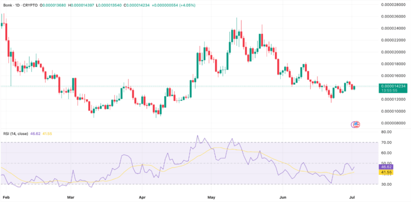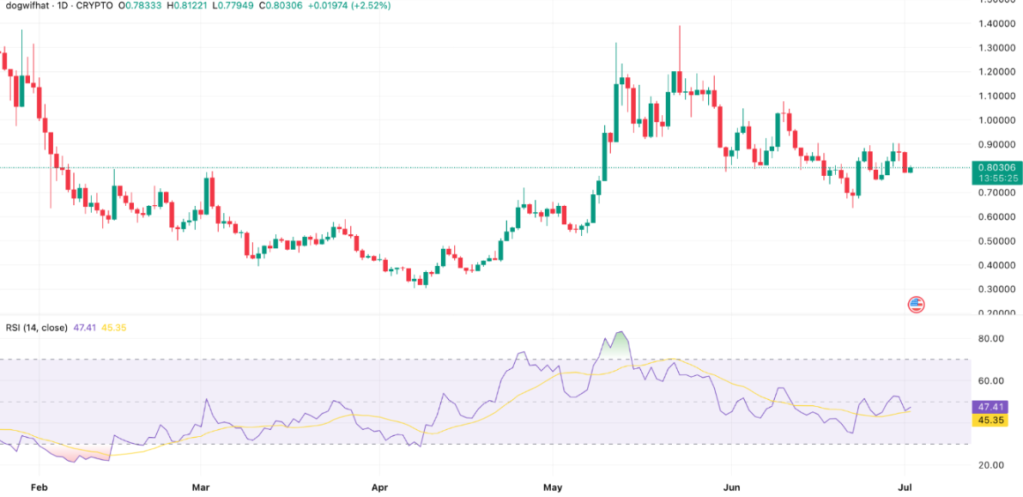Na de rally in mei volgde een flinke correctie en consolidatie rond $0,75 en $0,90. De huidige RSI bevindt zich stabiel rond de 47 en lijkt op weg naar een potentieel bullish momentum. De verkoopdruk neemt af, waardoor er ruimte ontstaat voor een herstel rally. Dogwifhat is een populaire token voor een volgende crypto rally.