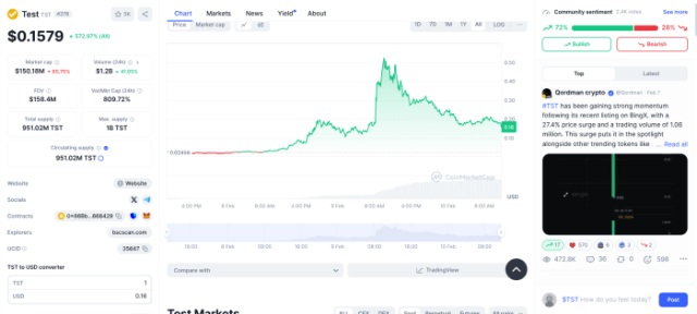 Lancé le 7 février dernier, le jeton TEST ($TST) a énormément fait parler au cours des dernières heures. En effet, ce dernier a battu ses records de valeurs en enregistrant des performances pour le moins exceptionnelles, passant d’une valeur de 0,02456 centime par jeton, à 0,5227 centime, en l’espace de 24 heures environ.