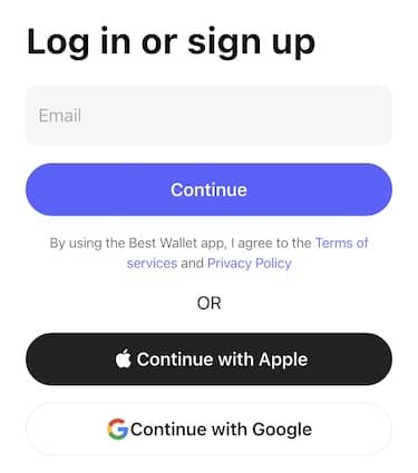 アプリを起動後、「Welcome to Best Wallet」という画面が出てくるので、「Get Started」をタップ。すると登録画面が出てくるので、メールアドレスやGoogleアカウントなどで登録してください。