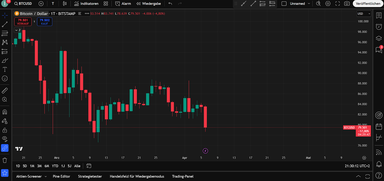Der Kryptomarkt erlebt gerade wilde Zeiten. Nachdem Donald Trump in der vergangenen Woche seinen Zoll-Hammer angekündigt hatte, sind die Kurse vieler Coins stark eingebrochen. Bitcoin konnte sich zunächst noch recht wacker halten und erzielte am Freitag, dem Tag des größten Abverkaufs seit Corona an den Aktienmärkten, zunächst sogar noch einen Gewinn. Doch heute scheint die Situation erneut zu eskalieren.