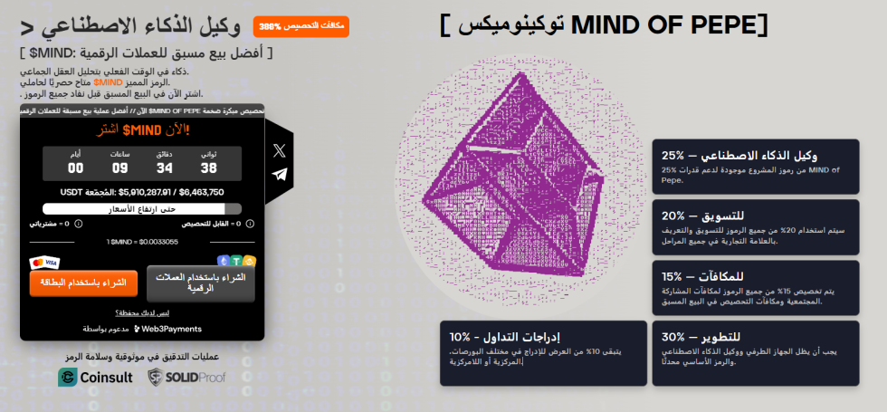 يعمل MIND of Pepe ($MIND) على شبكة ايثريوم، إحدى أقوى سلاسل العملات الرقمية، ويدمج الذكاء الاصطناعي ضمن آلية عمله بطريقة غير مسبوقة. حاليًا، يكون الرمز في المرحلة 17 من البيع المسبق، وسيرتفع سعره خلال أقل من يوم أو عند تحقيق الهدف المنشود.