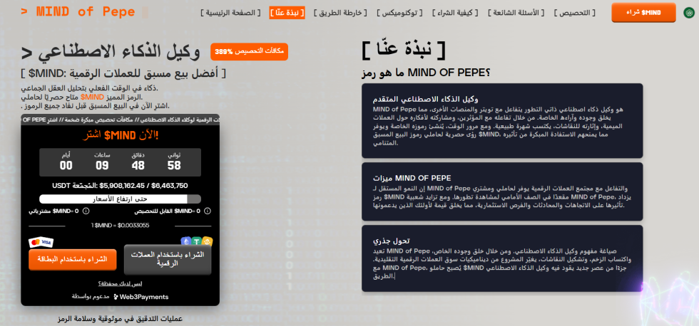 يتمتع $MIND بوكيل ذكاء اصطناعي متطور للغاية قد يجعله أحد أقوى الرموز الرقمية المستقبلية. وإذا استمر في التعلم والتطور، قد يصبح أذكى رمز رقمي في السوق. ما الذي تنتظره؟ انضم إلى ثورة العملات الرقمية الميمية المعتمدة على الذكاء الاصطناعي عبر دليلنا السريع لكيفية شراء MIND of Pepe!
