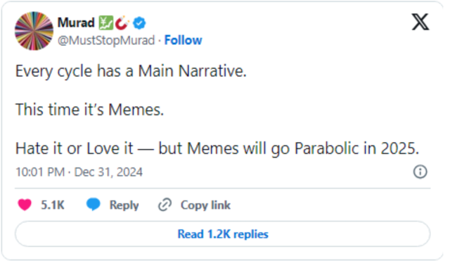 2024 год уже называли годом мем-коинов, но многие эксперты считают, что их настоящая популярность еще впереди. Например, Мурад Махмудов, известный аналитик, прогнозирует, что в 2025 году мемные монеты покажут еще более впечатляющие результаты.