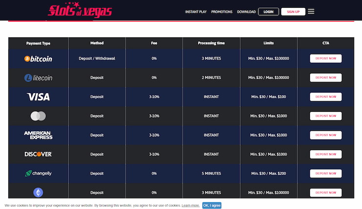 Supported crypto deposit options include Visa, Mastercard, American Express, Discover, USDT, USDC, BTC, and LTC. If you do not own any crypto, you can buy one through your card using the casino’s payment gateway, Changelly.