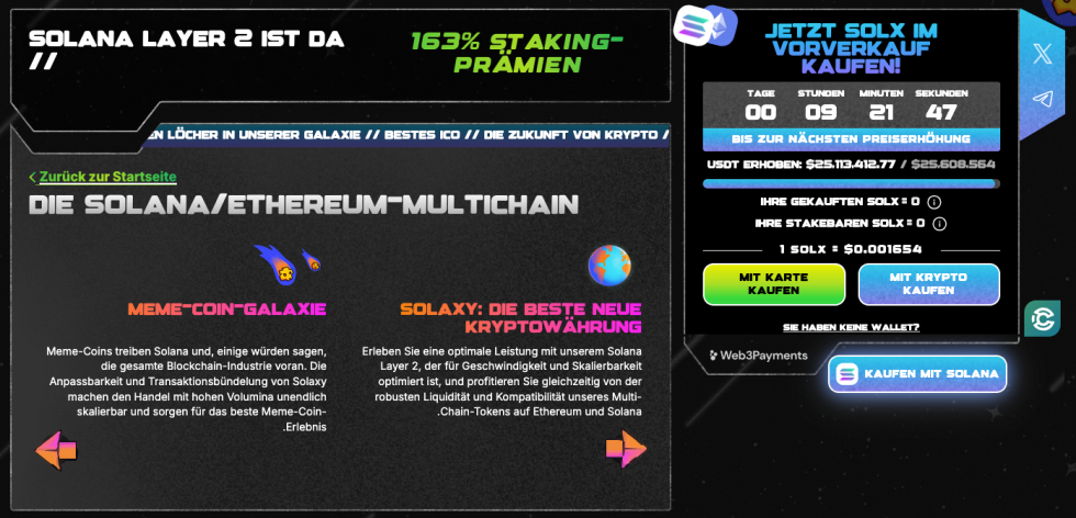 Um genau ein solches Projekt handelt es sich derzeit unter anderem bei Solaxy mit seinem Coin SOLX. Das Projekt befindet sich noch vor dem ersten offiziellen Börsenlisting seiner Kryptowährung, und der Coin kann aktuell ausschließlich über die offizielle Website im dortigen Presale erworben werden.