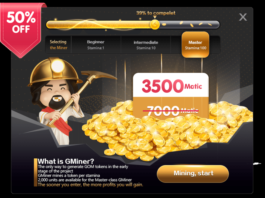 GMiner NFT holders are given independent mining rights for GOM tokens at the earlier stage. GMiner is divided into three levels. Beginner, expert, and professional, depending on their stamina. Each stamina is able to mine 1 GOM token per day. The professional grade will only issue a maximum of 2,000. Its daily mining quantity is 200,000 GOM at most. We are currently offering you a massive 50% discount on GMiner for a limited time as an ice-breaking. GMiner is also the only way to generate GOM tokens at the moment. The sooner you get GMiner NFTs, the more profits you will gain.