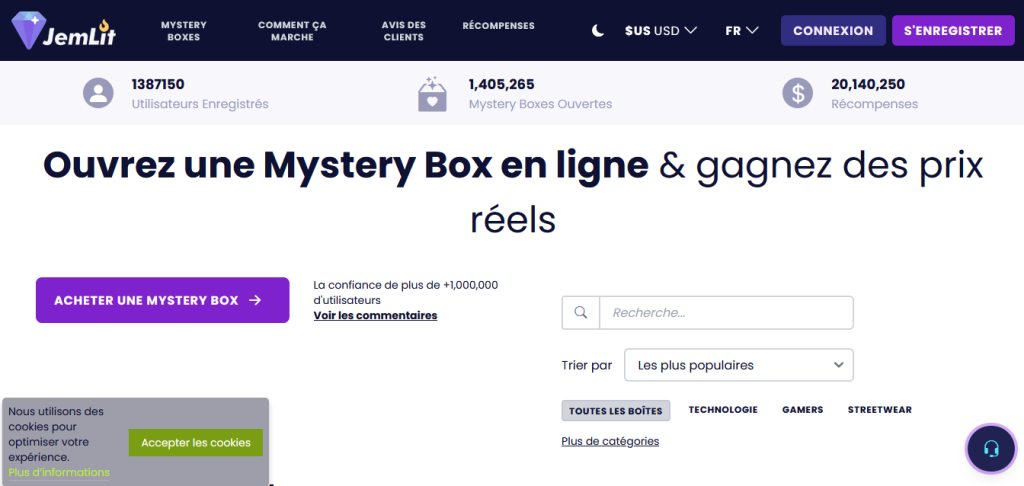 JemLit est notre premier choix pour sa large gamme de mystery box qui se distinguent par leur prix et leur contenu. 1,3 million d’utilisateurs ont déjà acheté 1,4 million de mystery box d’une valeur supérieure à 20 millions de dollars.