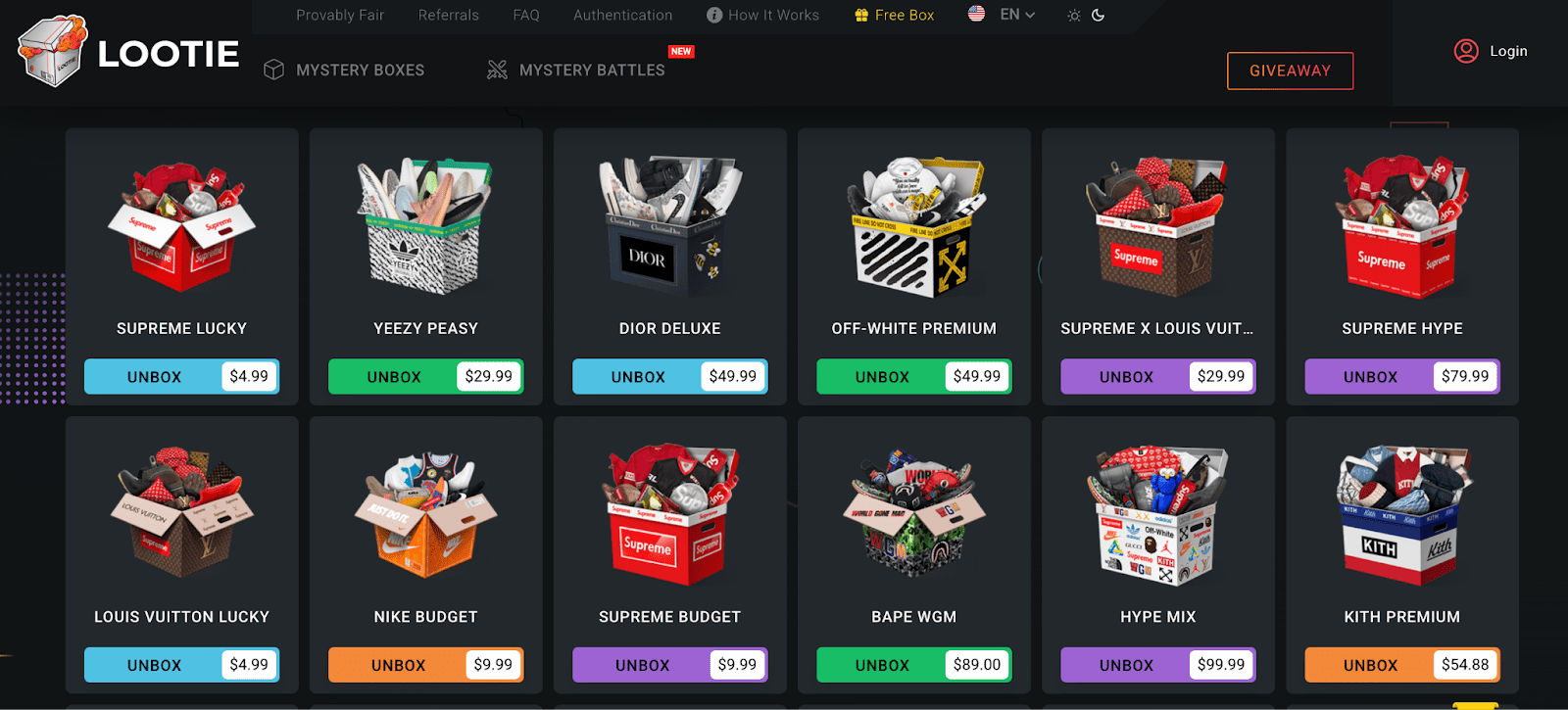 Lootie hat sich vor allem im Bereich Luxusmode einen Namen gemacht. Wer auf hochkarätige Streetwear und Designerlabels steht, findet hier eigene Boxen für Marken wie Louis Vuitton, Supreme oder Gucci. Schon ab rund 5 US-Dollar lassen sich Boxen öffnen, die teils hochpreisige Artikel versprechen – von Sneakern im vierstelligen Bereich bis zu edlen Taschen. Auch reine Cent-Boxen sind da, die kaum einen Dollar kosten und trotzdem Überraschungen wie iPhones oder Nike Air Force enthalten können.