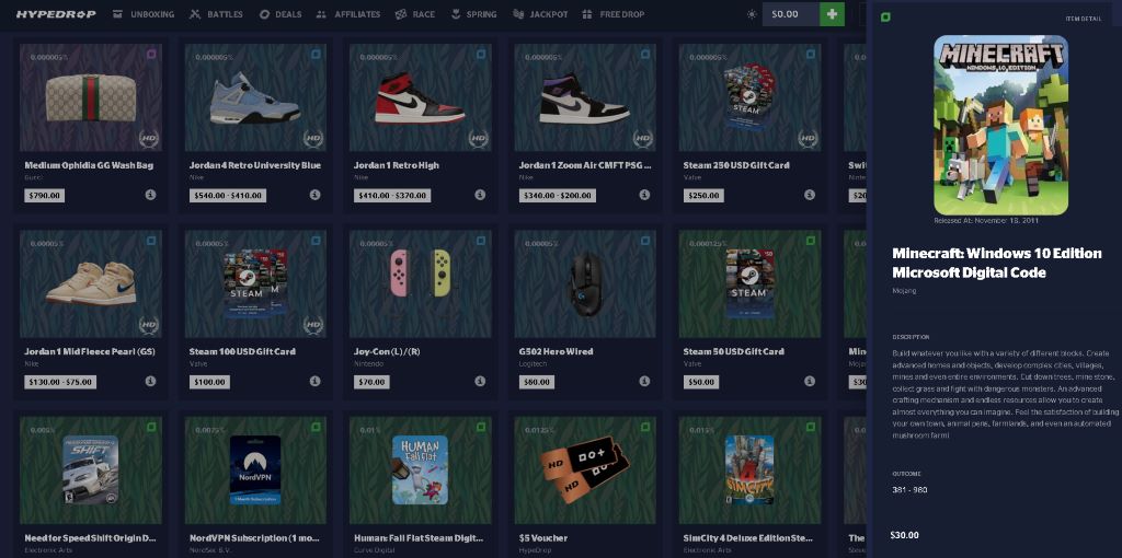 Hypedrop atrage atenția cu oferta sa variată de mystery box Minecraft și alte loot box-uri pentru pasionații de gaming. Această platformă de gaming din 2025 se remarcă printr-un concept inovativ, ce combină elemente din cultura urbană și iteme exclusiviste din diverse jocuri video. Fie că ești un fan al Minecraft sau al altor titluri populare, Hypedrop are cutii care satisfac toate preferințele, iar fiecare deschidere aduce o nouă surpriză plină de emoție.