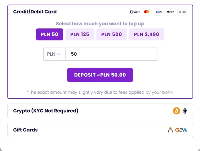 Po zakończeniu rejestracji możesz dodać środki do swojego konta. Minimalny depozyt wynosi 50 złotych. Konto doładujemy za pomocą karty kredytowej, ale można też użyć kryptowalut.