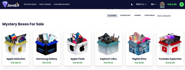 Jeśli lubisz dreszczyk emocji, spodoba ci się zabawa w mystery box. JemLit nie tylko zapewnia przegląd produktów, które mogą się znaleźć w twoim lootboxie, ale też umożliwia wymianę pudełka na kredyty, jeśli przesyłka nie trafi w twój gust. Można też sprawić przyjemność bliskiej osobie i kupić jej kartę podarunkową JemLit, by sama mogła wybrać swoje tajemnicze pudełko.