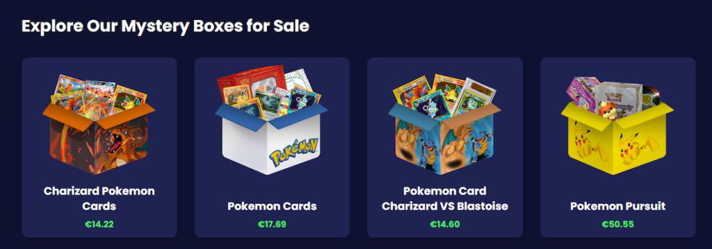 Lootie je platforma zaměřená na online mystery boxy, kde si uživatelé mohou vybírat z různých tematických boxů a virtuálně je otevírat. V případě výhry lze předměty zaslat domů, což spojuje digitální zábavu s reálným produktem. Pokémon boxy jsou součástí nabídky, ale nejsou hlavním zaměřením. Produkty jsou obvykle skladem a připraveny k okamžitému odeslání.