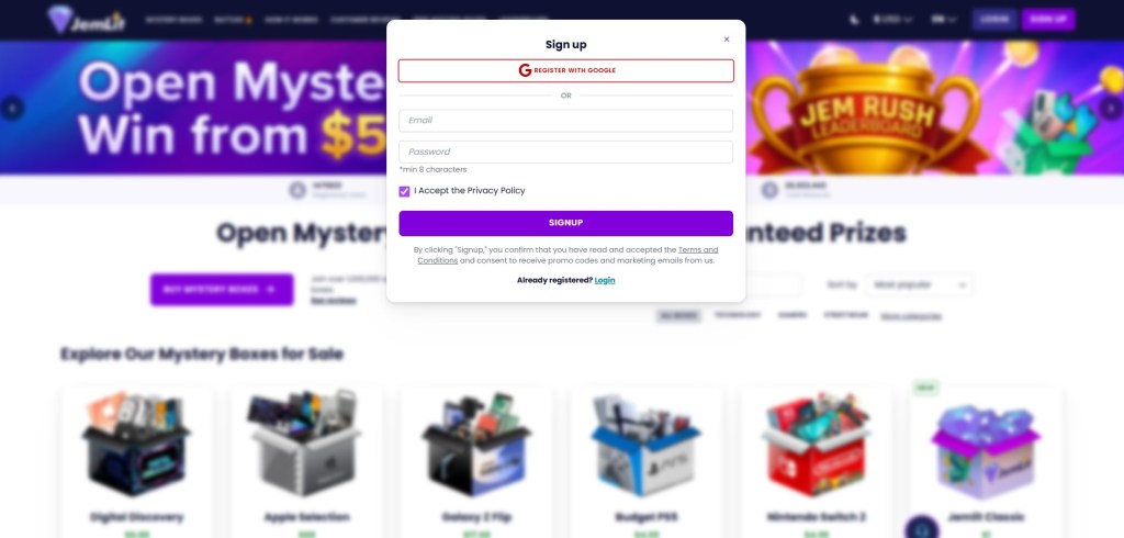 Za začetek je potreben uporabniški račun na platformi JemLit. Registracija je enostavna in hitra – vpišete osnovne podatke, potrdite e-pošto in že ste pripravljeni za raziskovanje sveta mystery box presenečenj.
