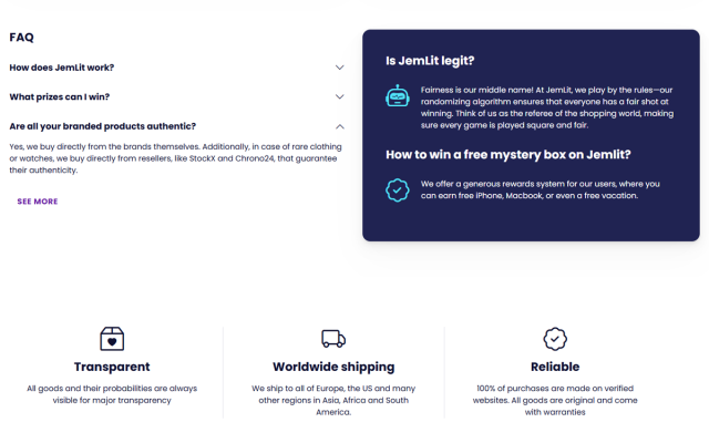 Επιπλέον, η JemLit εμφανίζει ξεκάθαρα τις πιθανότητες για κάθε δώρο πριν ο χρήστης ανοίξει ένα κουτί. Αυτό σημαίνει ότι οι παίκτες μπορούν να δουν τι ποσοστό επιτυχίας έχει ένα iPhone σε ένα premium κουτί, σε σύγκριση με ένα πιο συνηθισμένο δώρο όπως ένα gaming headset.