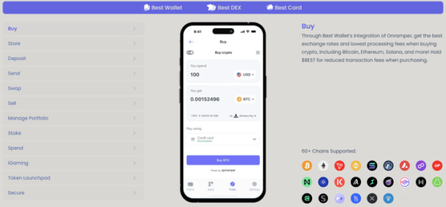 Best Wallet разполага и с интеграция с OnRamper, което ви позволява лесно да зареждате портфейла си с едни от най-добрите обменни курсове и най-ниски такси за обработка.