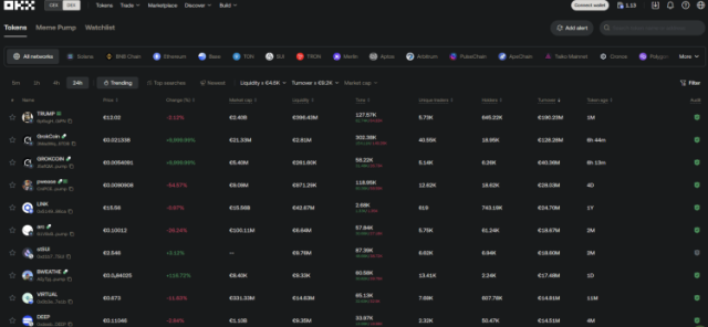 DEX платформата на OKX Wallet също предлага множество функции, ориентирани към потребителя. Освен стандартните крос-чейн суапове, разполагате и с: „Meme trading mode“ без такси за най-добрите меме койни, NFT маркетплейс с водещи колекции и редки Bitcoin runes. Раздел за откриване на airdrop-и, където можете директно да участвате и да печелите нови безплатни токени