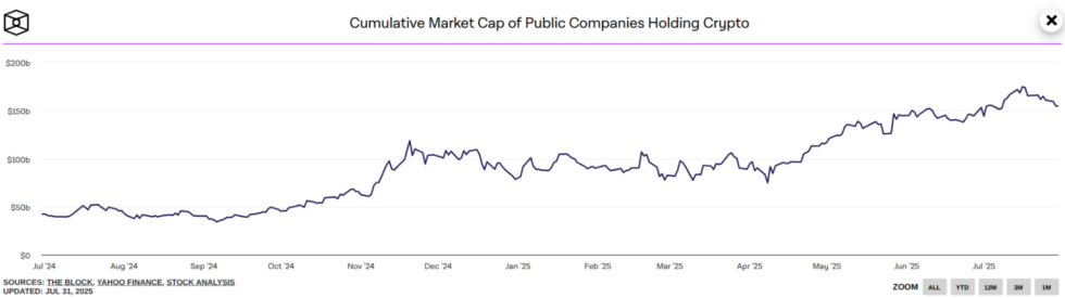 Само за половин година стойността на публичните компании, притежаващи криптовалути, скочи от $90 млрд. до над $160 млрд. Този ръст ясно показва засилен интерес към дигиталните активи дори чрез традиционни американски акции – предпочитан път за много инвеститори.