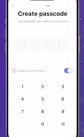 Po úspešnej registrácii si nastavte štvormiestny bezpečnostný kód, ktorý budete používať na prístup do peňaženky. Tento kód si dobre uložte.