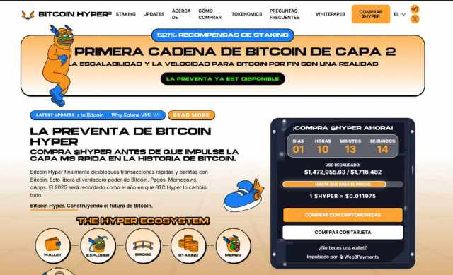 El auge de BTC está aumentando la congestión en la red. Es por esta razón que la preventa de Bitcoin Hyper ha tenido tanto éxito. Muchas consideran que es la mejor criptomoneda para invertir de la actualidad y es que el proyecto ha sido creado para mejorar la escalabilidad de Bitcoin. Hasta el momento, la recaudación de su preventa acumula más de 1,4 millones de dólares.