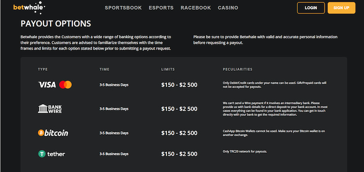 Deposits are quick and fast with BetWhale. This sportsbook processes card, e-wallet, and gift card deposits instantly. There is also no limit on its crypto deposits, which makes it an excellent option for high rollers.
