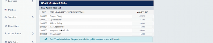 The betting odds for the NBA Draft on BetUS show Cooper Flagg (-20000) is a near-lock for No.1 pick in 2025. If long shots are your thing, consider taking an early bet on other contenders like Dylan Harper (+1600) or Airious Bailey (+3000).