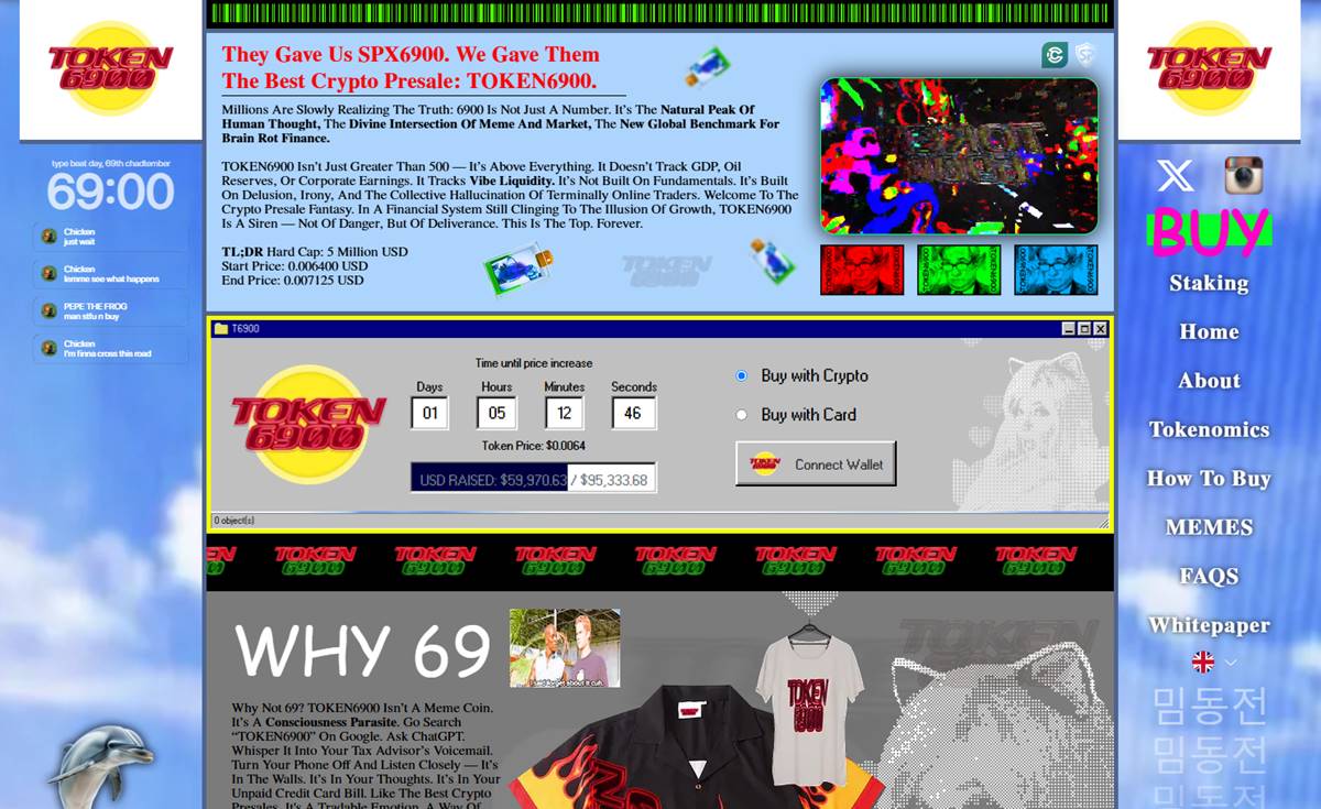 TOKEN6900は、インターネット文化と2000年代のノスタルジー、そして“69”という数値に象徴される独特なエネルギーに着想を得たものであり、実用性がないことを公言している。ハードキャップは500万ドル(約7億9,500万円)に設定され、総供給量の80%(7億4,479万4,473トークン)がプレセール対象となっている。