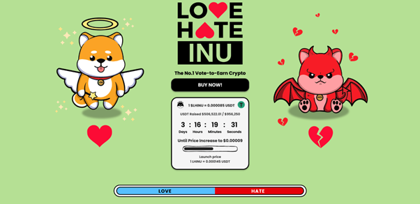 Love Hate Inu, a brand-new ‘Vote-to-Earn’ (V2E) crypto project, has just breached the $700,000 mark during its presale – in just over seven days.