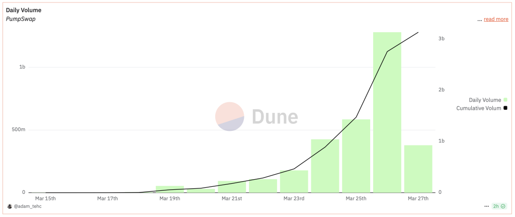 จากข้อมูลด้านล่าง ปริมาณการซื้อขายรายวันของ PumpSwap เพิ่มขึ้นเกือบเท่าตัวทุกๆ สองวันนับตั้งแต่เปิดตัว แม้ว่ายังเร็วเกินไปที่จะบอกว่าปริมาณวันนี้จะมากกว่าเมื่อวานหรือไม่