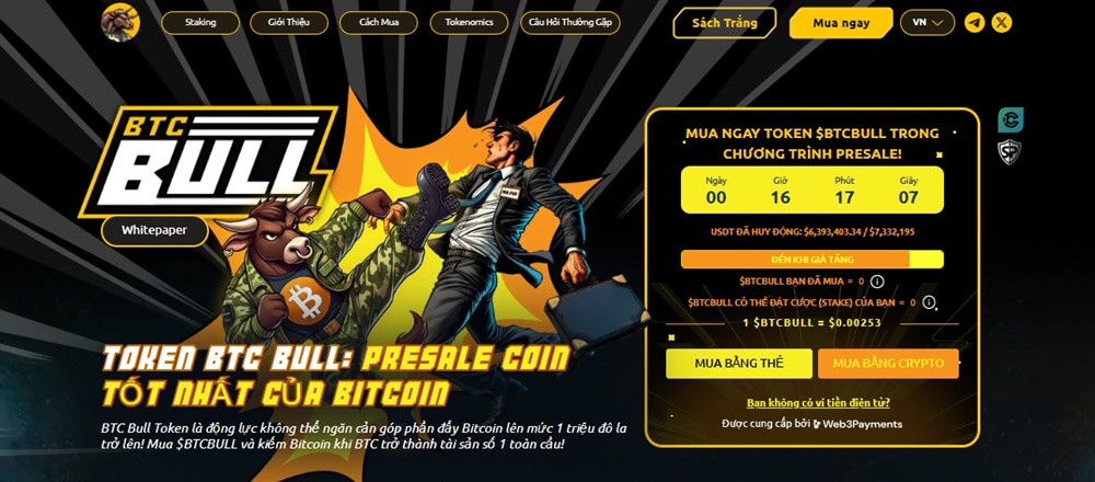 BTC Bull Token là một meme coin đại diện cho động lực không thể ngăn cản sẽ đưa Bitcoin lên $1 triệu và hơn thế nữa. Nó tôn vinh cơ hội có một không hai này khi động lực tăng giá cho tiền điện tử tăng tốc vào năm 2025.