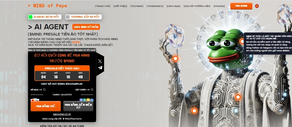 Mind of Pepe (MIND) là memecoin đầu tiên tích hợp với AI agent, tạo nên sự kết hợp độc đáo giữa công nghệ trí tuệ nhân tạo và văn hóa meme. Nhờ sự tích hợp này, dự án không chỉ mang tính giải trí mà còn có tiềm năng ứng dụng thực tế trong hệ sinh thái tiền điện tử. Mind of Pepe hướng tới việc trở thành người tiên phong trong làn sóng crypto được hỗ trợ bởi AI, mang đến cách tiếp cận sáng tạo cho nhà đầu tư toàn cầu.