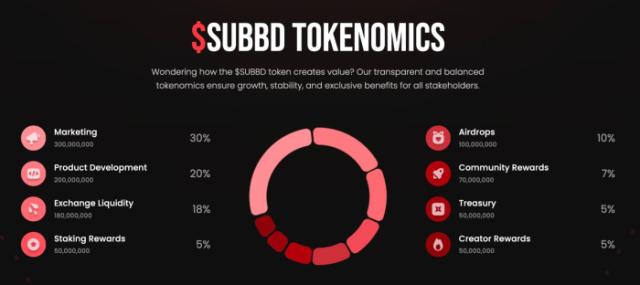 Now, let’s talk tokenomics. Of $SUBBD’s 1B token supply, 30% is allocated to marketing. That’s a good move, as brand awareness, establishing partnerships, and growing the platform’s user base will be essential to this project’s long-term success.