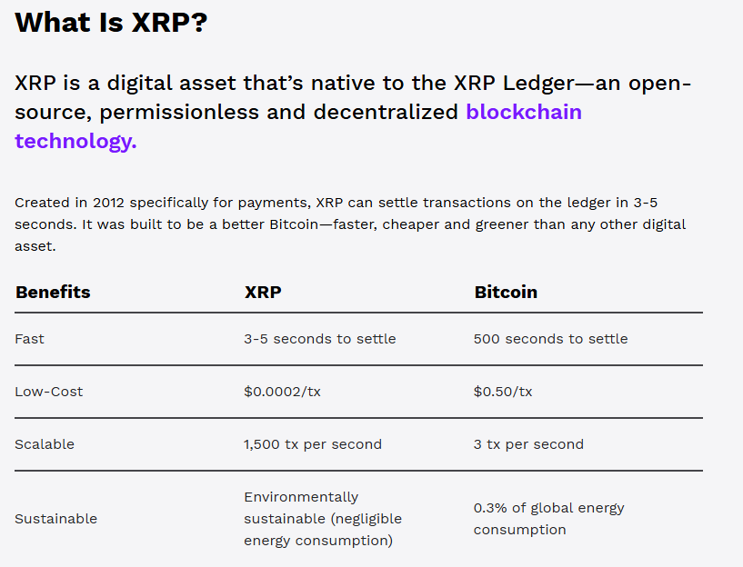وتدعم العملة نظام XRP Ledger التقني، وهي شبكة بلوكتشين لامركزية مفتوحة المصدر تُعرَف بأدائها المتفوّق مقارنة ببلوكتشين بيتكوين (Bitcoin blockchain).