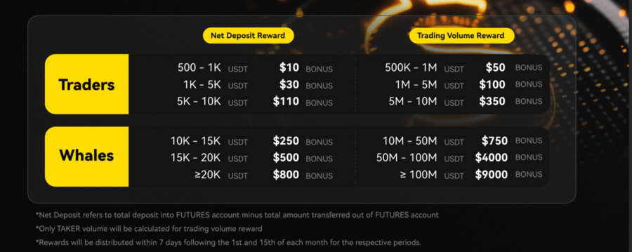 KCEX提供比特幣和以太坊期貨交易,以及一些最熱門的迷因幣期貨交易。平台用戶還可以存取獨家空投,並在完成某些任務後獲得高達9800美元的註冊獎勵。