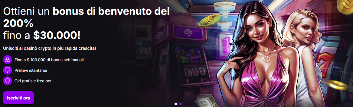 | Criptovalute accettate | Bitcoin, USDT, Litecoin, Ethereum, DOGE, Binance. |