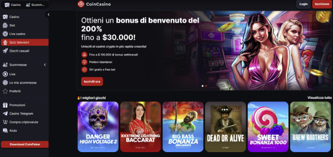 Tra le novità nel settore del gambling, uno dei casino con maggiore successo è proprio CoinCasino. Questa piattaforma è molto interessante, tra i nuovi casino Italia, grazie ad un’offerta in catalogo molto variegata e ampia che va dalle slot machine migliori, ai giochi di carte più famosi e alle scommesse.