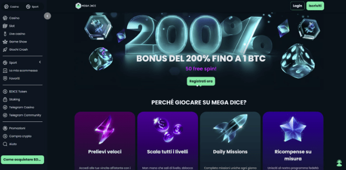 Ciò rende la piattaforma molto veloce, anche grazie alla presenza delle criptovalute. Per quanto riguarda, infine, le promozioni disponibili su Mega Dice, i nuovi utenti potranno usufruire di un allettante bonus di benvenuto che offre un rimborso del 200% sul primo deposito, fino a 1 Bitcoin.