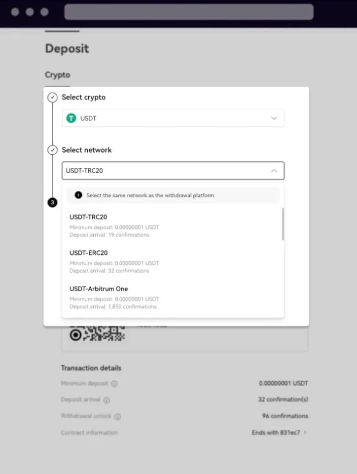6. lépés: Válaszd ki a befizetni kívánt kriptót és hálózatot.