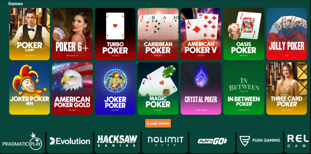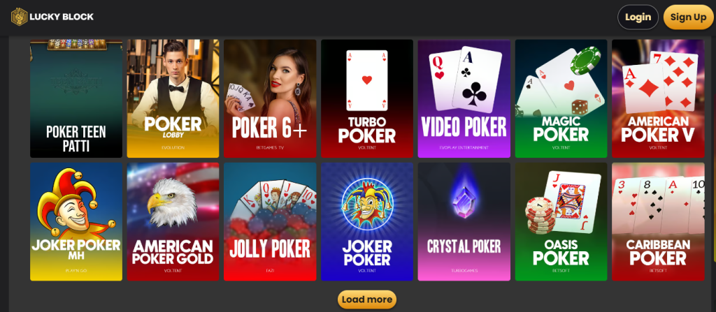 V herní knihovně najdete více než 4 000 her, včetně výherních automatů od top poskytovatelů (Evolution Gaming, Novomatic a dalších), stolních her a živého casina s profesionálními krupiéry. Pro milovníky pokeru Lucky Block nabízí řadu možností, včetně méně známých variant jako High Hand Hold’em či Poker 6+. V sekci live casina hráči mají na výběr celkem 13 stolů.