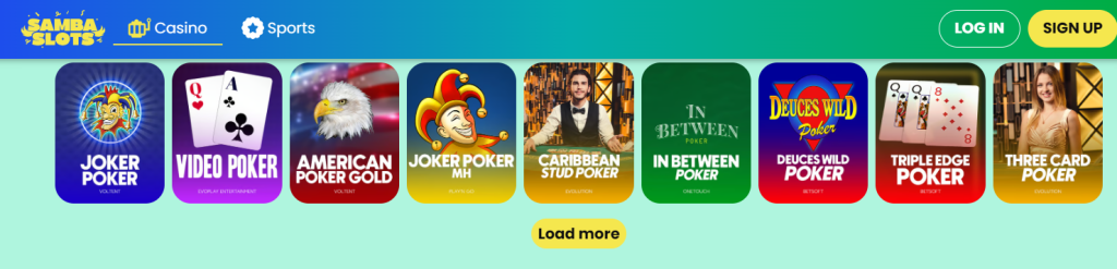 Hlavním zaměřením casina jsou především automaty, ale v nabídce najdete i různé varianty stolních her a živé casinové hry. Samba Slots spolupracuje se špičkovými vývojáři jako NetEnt nebo Pragmatic Play a nabízí inovativní videoautomaty i klasické tituly. Poker je na Samba Slots zastoupen hlavně v živé verzi a vyzkoušet můžete kterýkoliv z celkem 18 stolů, včetně méně hraných variant jako Jacks or Better, Triple Edge nebo Oasis Poker.