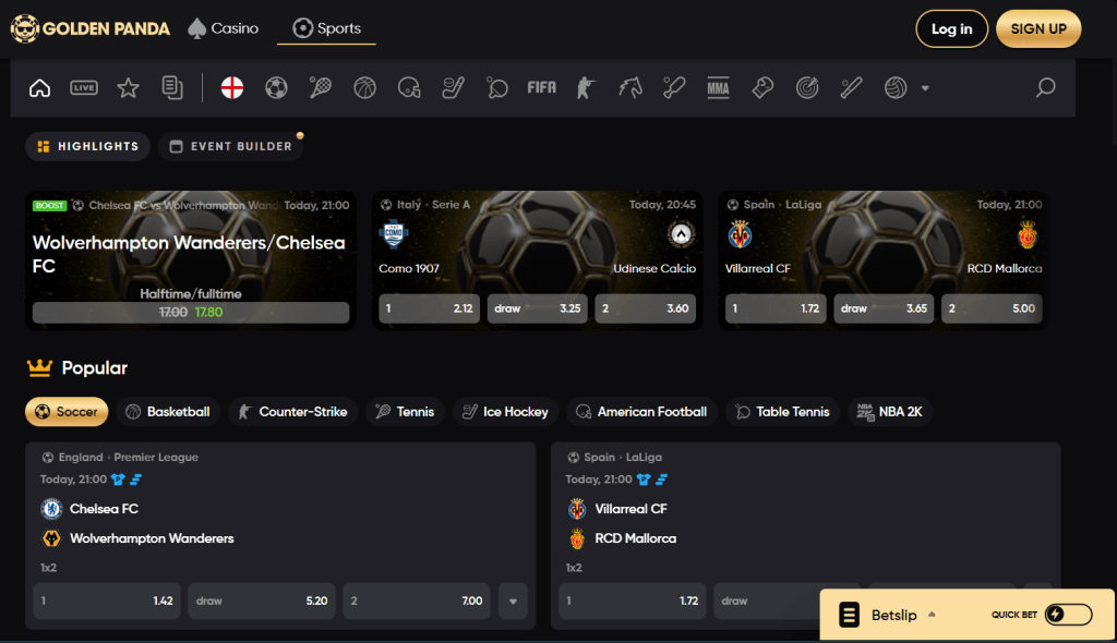 Patříte mezi hráče, kteří milují sázení na fotbal, ale občas neodolají pořádnému automatu? Golden Panda spojuje oba světy do jedné elegantní platformy, která nezapomíná ani na detaily – od štědrých bonusů až po rychlé výběry. Sportovní sekce zaujme širokým výběrem více než 50 sportů, včetně klasiky jako fotbal, hokej či tenis. Milovníci méně tradičních disciplín si také přijdou na své, ať už jde o šipky, stolní tenis nebo e-sporty, jako je CS:GO a Dota 2. Live online sázení je zde dotažené k dokonalosti – nejenže můžete sledovat zápasy v přímém přenosu, ale díky betbuilderu lze kombinovat více událostí na jeden tiket a zvýšit tak napětí.