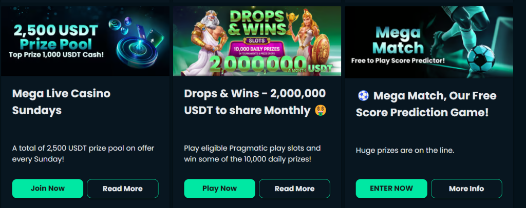 Noví uživatelé mohou využít uvítací bonus až 200 % do hodnoty 10 ETH, 50 zatočení zdarma a volnou sázku. Bonus se uvolňuje postupně, což hráčům umožňuje flexibilnější přístup k jeho využití. Kromě toho platforma nabízí staking vlastního tokenu TGC s atraktivním APY, což ocení především pravidelní uživatelé zapojení do věrnostního (loyalty) programu.